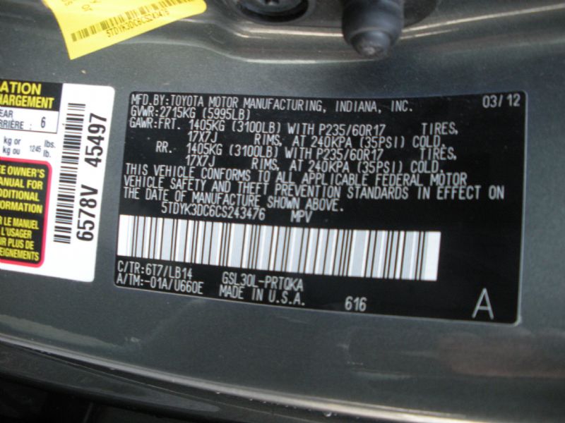 Other Notes: 2012 Toyota Sienna XLE 8 Passenger